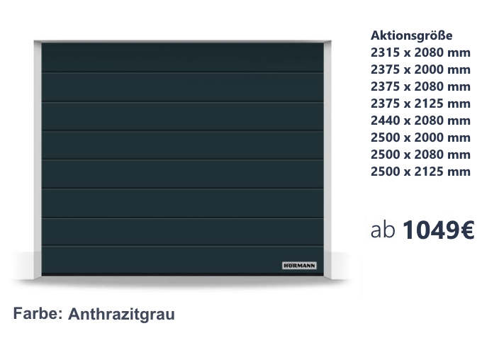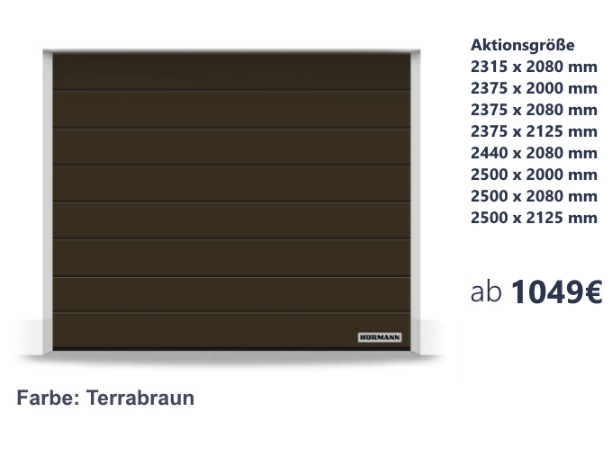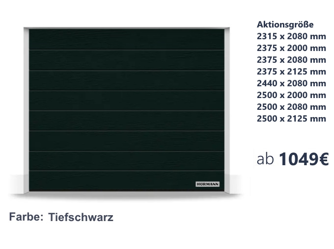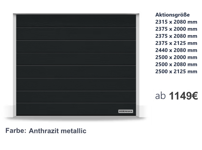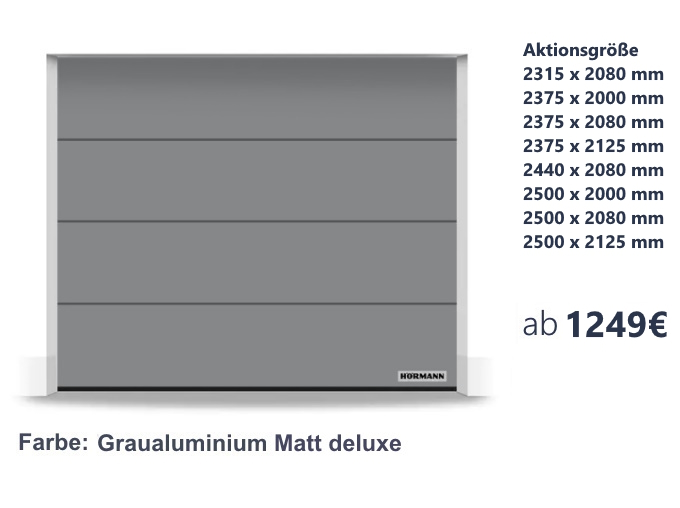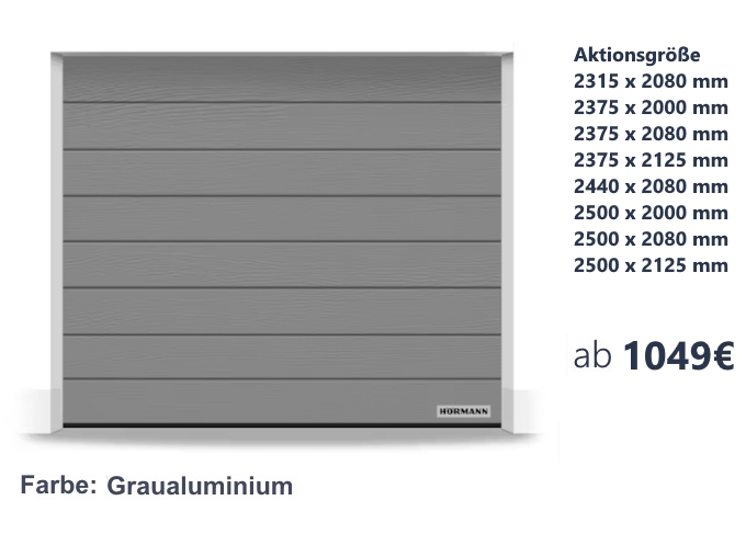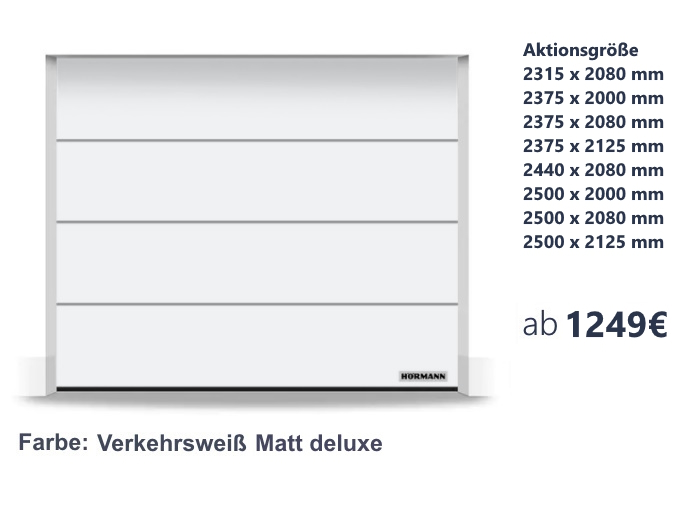 Die abgebildeten Farben und Oberflächen sind nicht farbverbindlich. Alle Farbangaben in Anlehnung an die RAL-Farbe. Abgebildete Aktionsgröße 2375x2000 mm. Abbildungen sind nicht Maßstabsgetreu.Änderungen und Preisirrtümer vorbehalten. Unverbindliche Preisempfehlung inkl. 19 % MwSt. für die Aktionstore in den Aktionsgrößen (RenoMatic: 2315 × 2080 mm, 2375 × 2000 mm, 2375 × 2080 mm, 2375 × 2125 mm, 2440 × 2080 mm, 2500 × 2000 mm, 2500 × 2080 mm, 2500 × 2125 mm) ohne Aufmaß, Montage, Demontage und Entsorgung. Gültig bis zum 31.12.2025 bei allen teilnehmenden Vertriebspartnern in Deutschland.