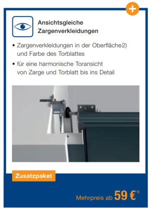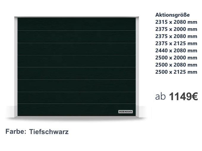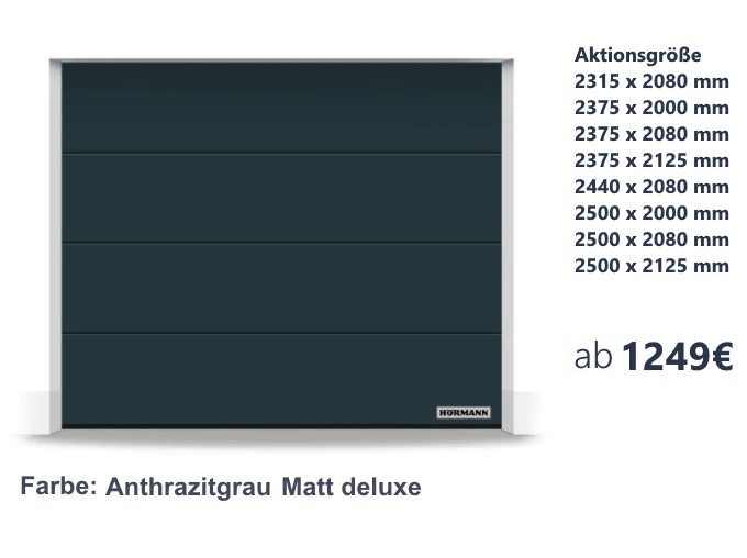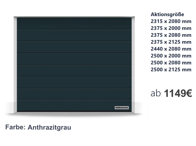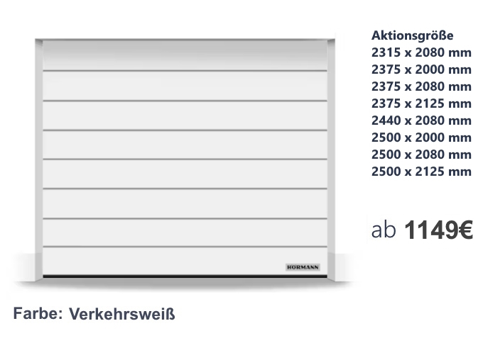 Die abgebildeten Farben und Oberflächen sind nicht farbverbindlich. Alle Farbangaben in Anlehnung an die RAL-Farbe. Abgebildete Aktionsgröße 2375x2000 mm. Abbildungen sind nicht Maßstabsgetreu.Änderungen und Preisirrtümer vorbehalten. Unverbindliche Preisempfehlung inkl. 19 % MwSt. für die Aktionstore in den Aktionsgrößen (RenoMatic: 2315 × 2080 mm, 2375 × 2000 mm, 2375 × 2080 mm, 2375 × 2125 mm, 2440 × 2080 mm, 2500 × 2000 mm, 2500 × 2080 mm, 2500 × 2125 mm) ohne Aufmaß, Montage, Demontage und Entsorgung. Gültig bis zum 31.12.2025 bei allen teilnehmenden Vertriebspartnern in Deutschland.